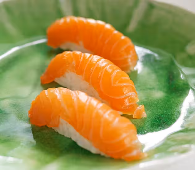 Dar forma a las piezas de nigiri sushi presionando los lados y la parte superior, de modo que el arroz y el filete se peguen entre sí. Presentar los nigiri en una fuente y servir junto con la salsa de soja, el wasabi y el jengibre.