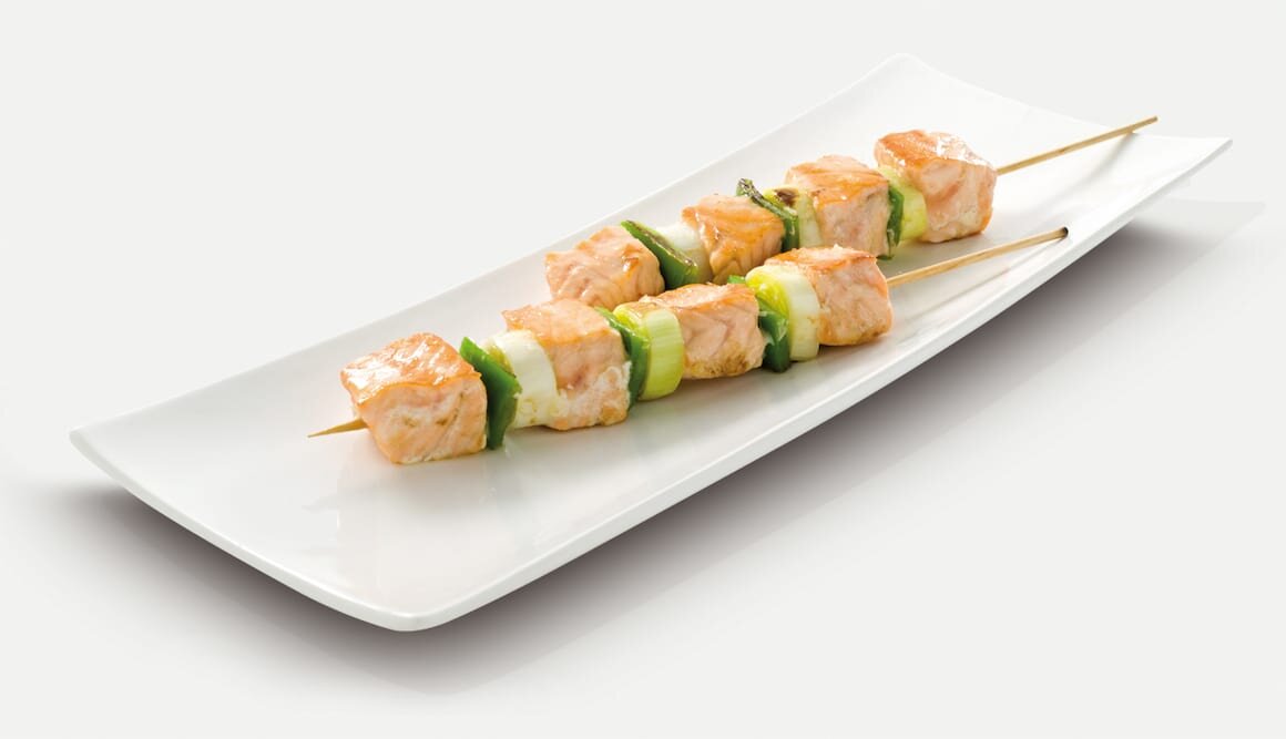 Insertar en los palitos de madera los tacos de salmón alternándolos con la verdura.