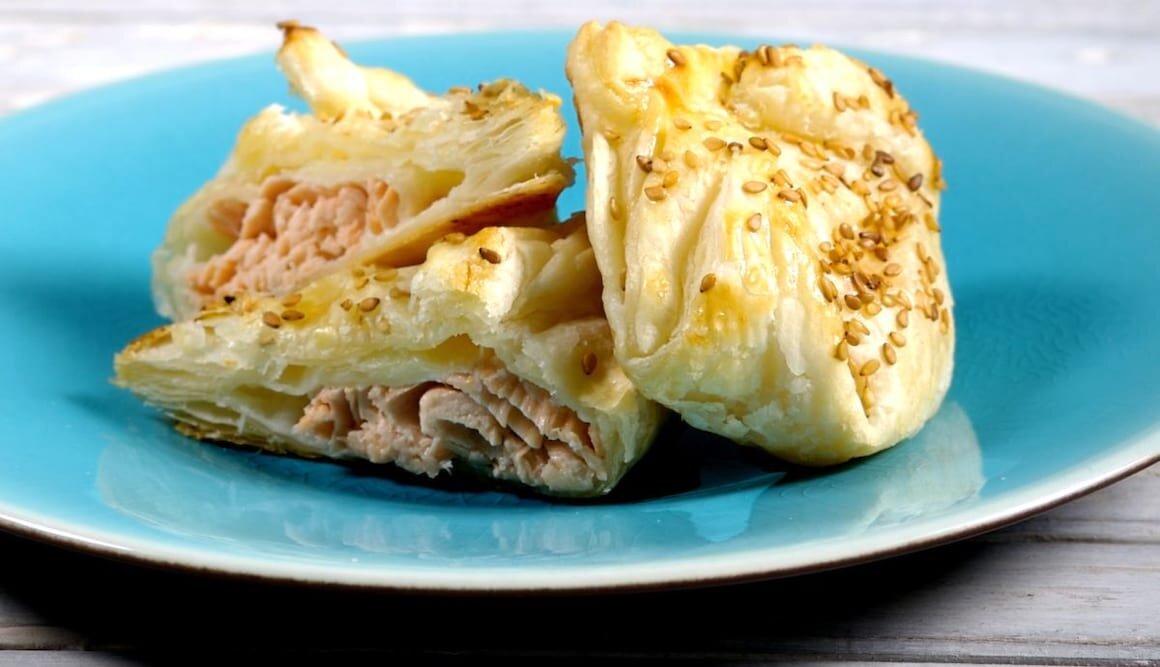 Estirar la masa de hojaldre y preparar 4 cuadrados lo suficientemente grandes.