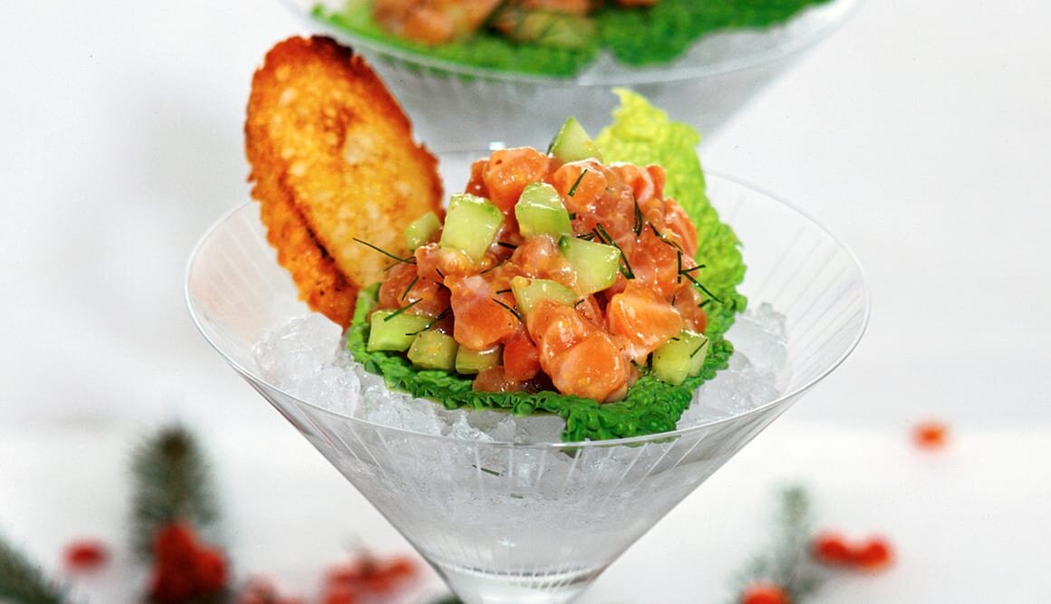 Servir el tartar de salmón decorándolo con una rebanada de pan tostado y una rodaja fina de limón.