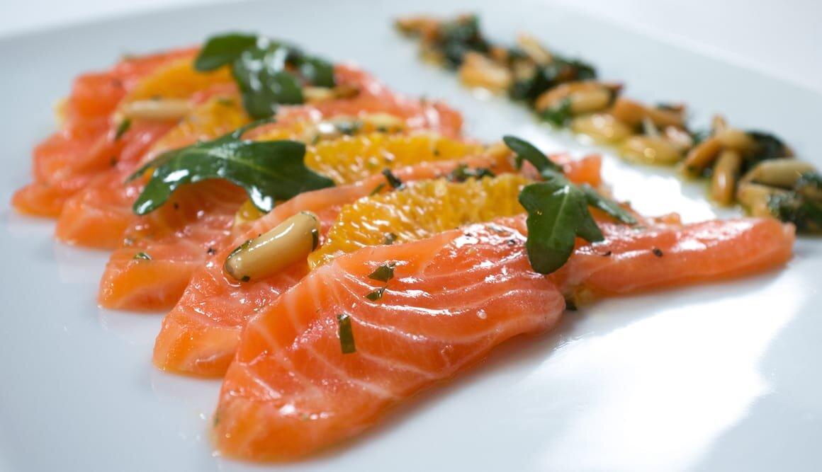Alternar las tiras de sashimi de Trucha del Fiordo y las tiras de naranja.